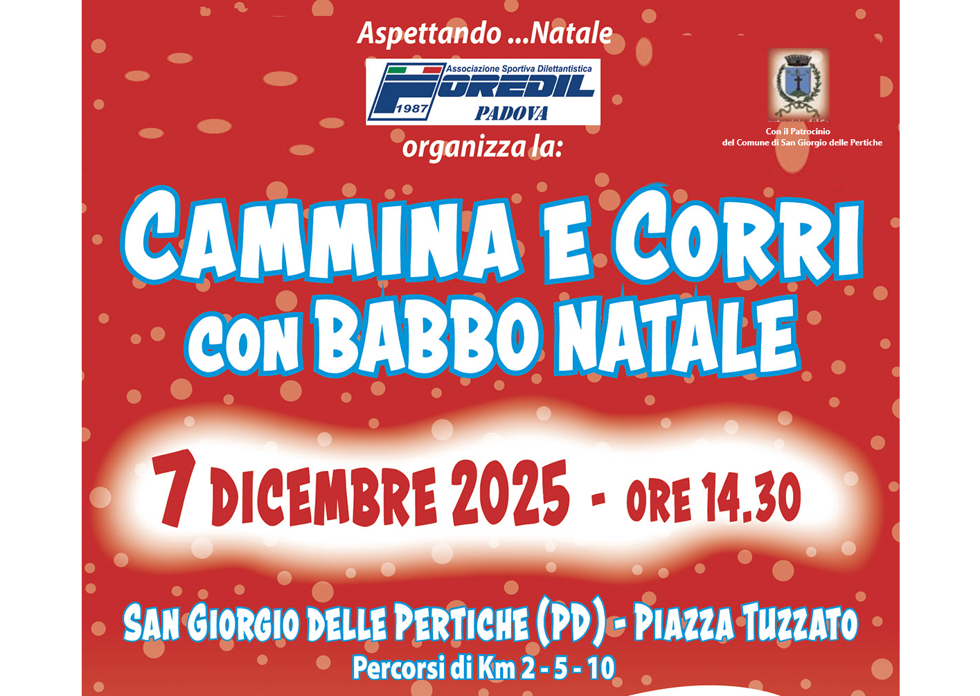 Il 7 dicembre 2025, alle 14.30, Atletica Foredil Macchine organizza la Camminata con Babbo Natale, con partenza da Piazza Tuzzato a San Giorgio delle Pertiche.