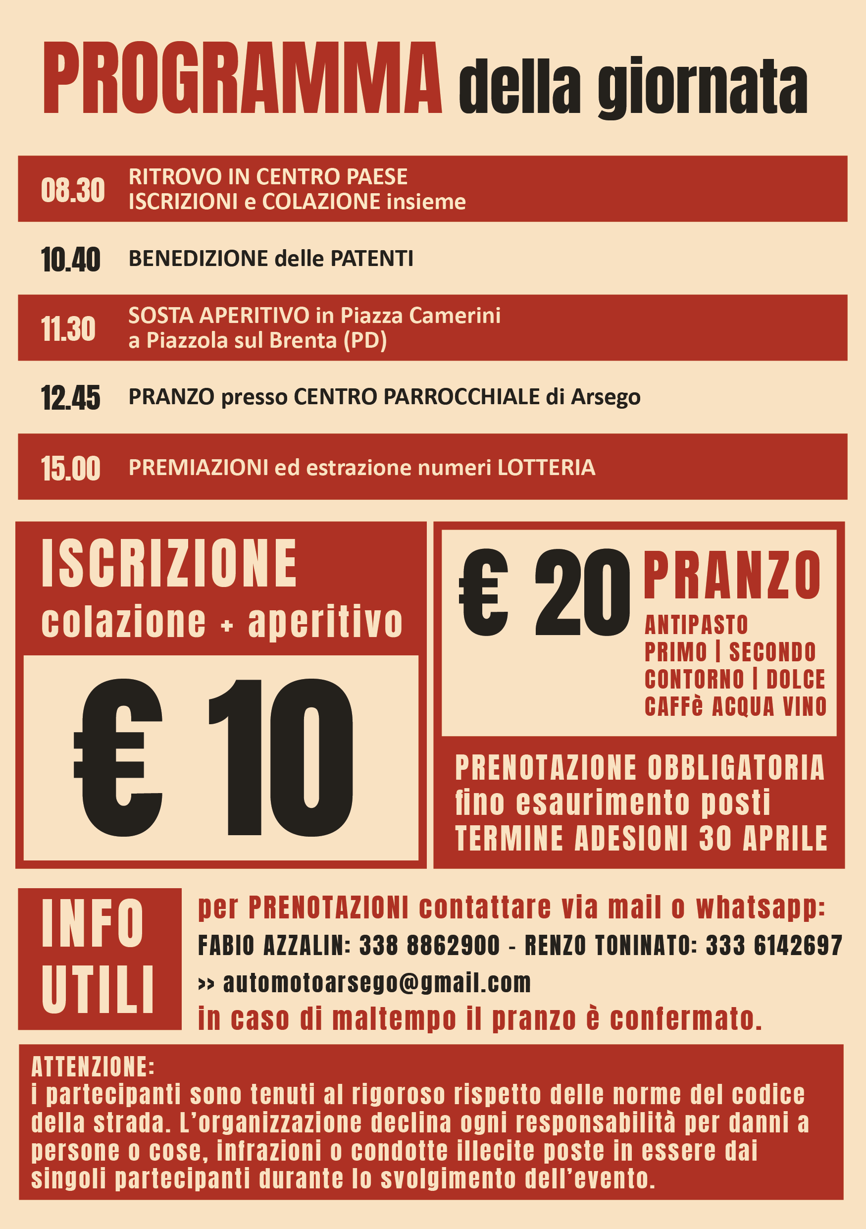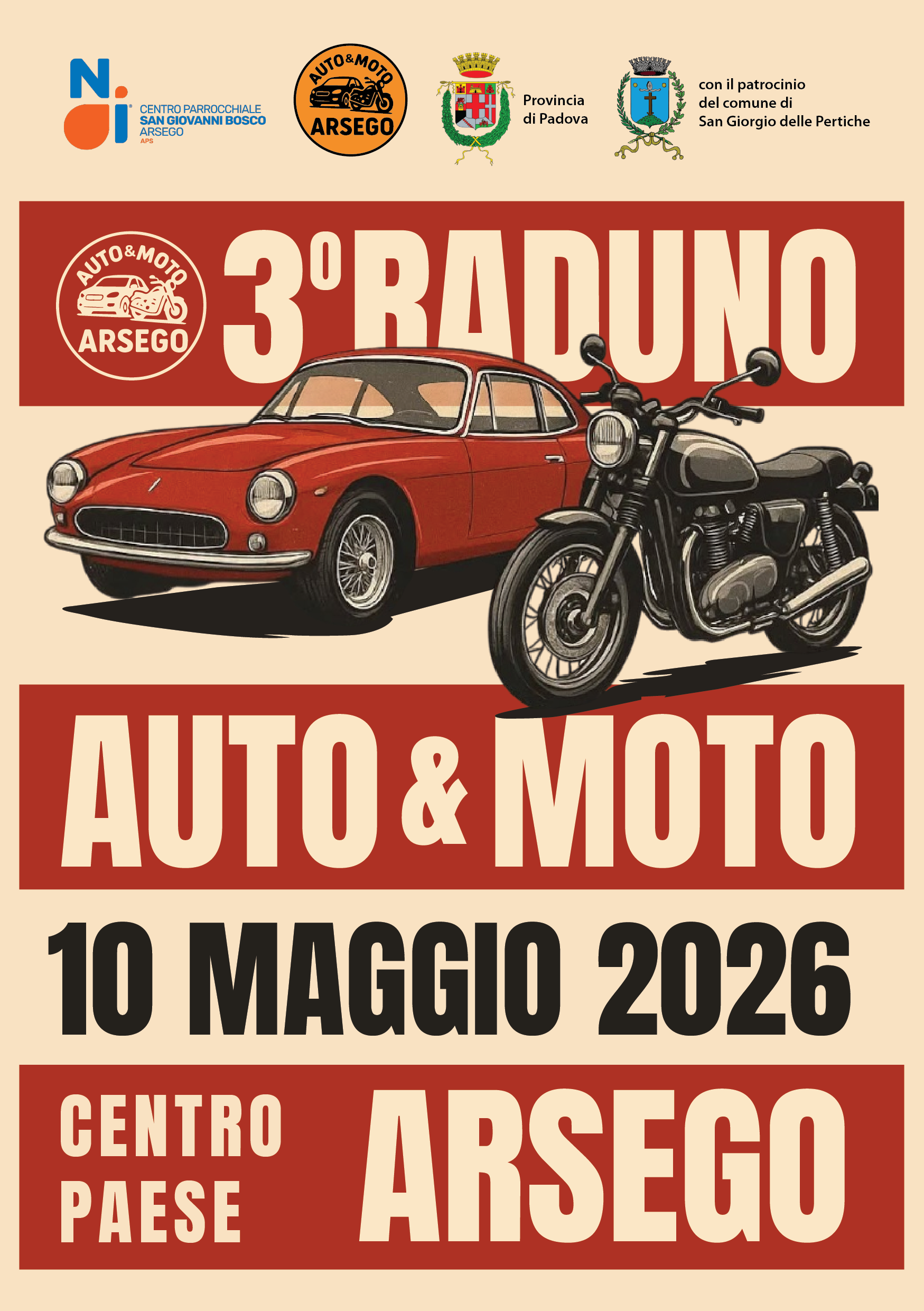 Il Centro Parrocchiale NOI "San Giovanni Bosco" di Arsego organizza, con il patrocinio della Provincia di Padova e il Comune di San Giorgio delle Pertiche il 3 Raduno Auto e Moto ad Arsego, domenica 10 maggio 2026.