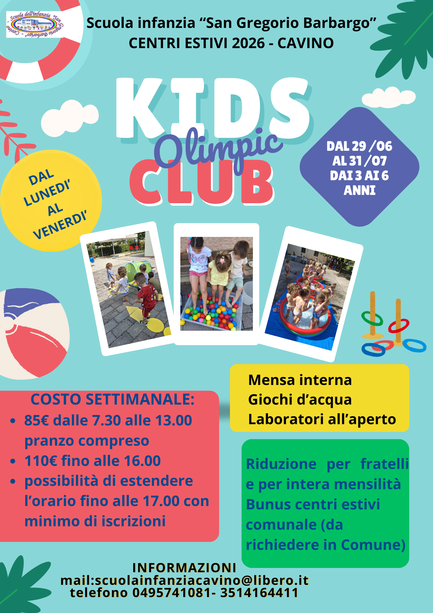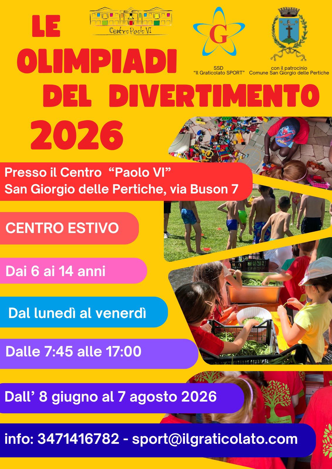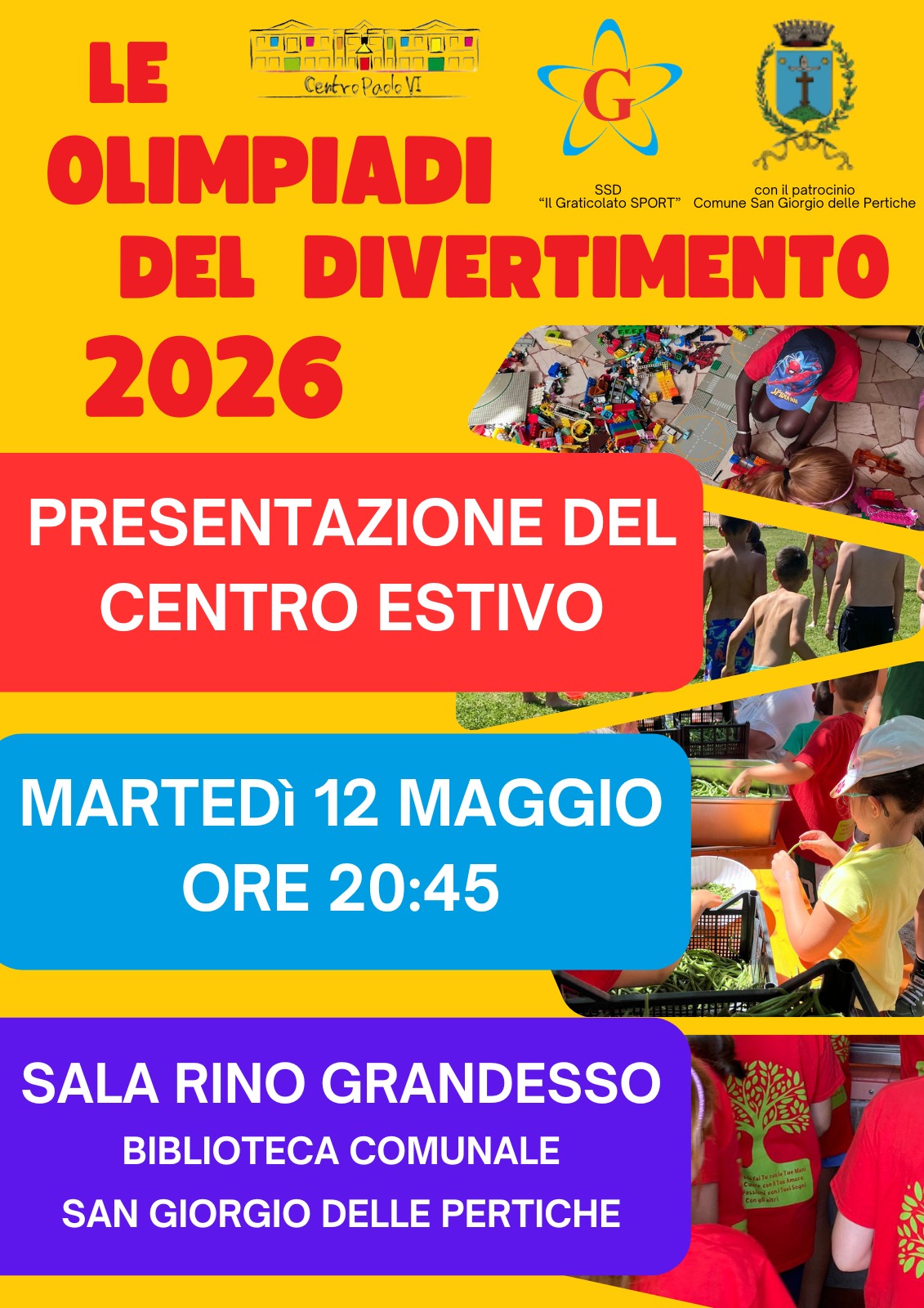 È previsto un incontro di presentazione dei Centri Estivi “Le Olimpiadi del Divertimento 2026” organizzato dall’Associazione “Il Graticolato” che si terrà martedì 12 maggio 2026 alle ore 20:45 presso la sala “Rino Grandesso” nella Biblioteca Comunale (Via Pinaffo n. 9 – San Giorgio delle Pertiche).
