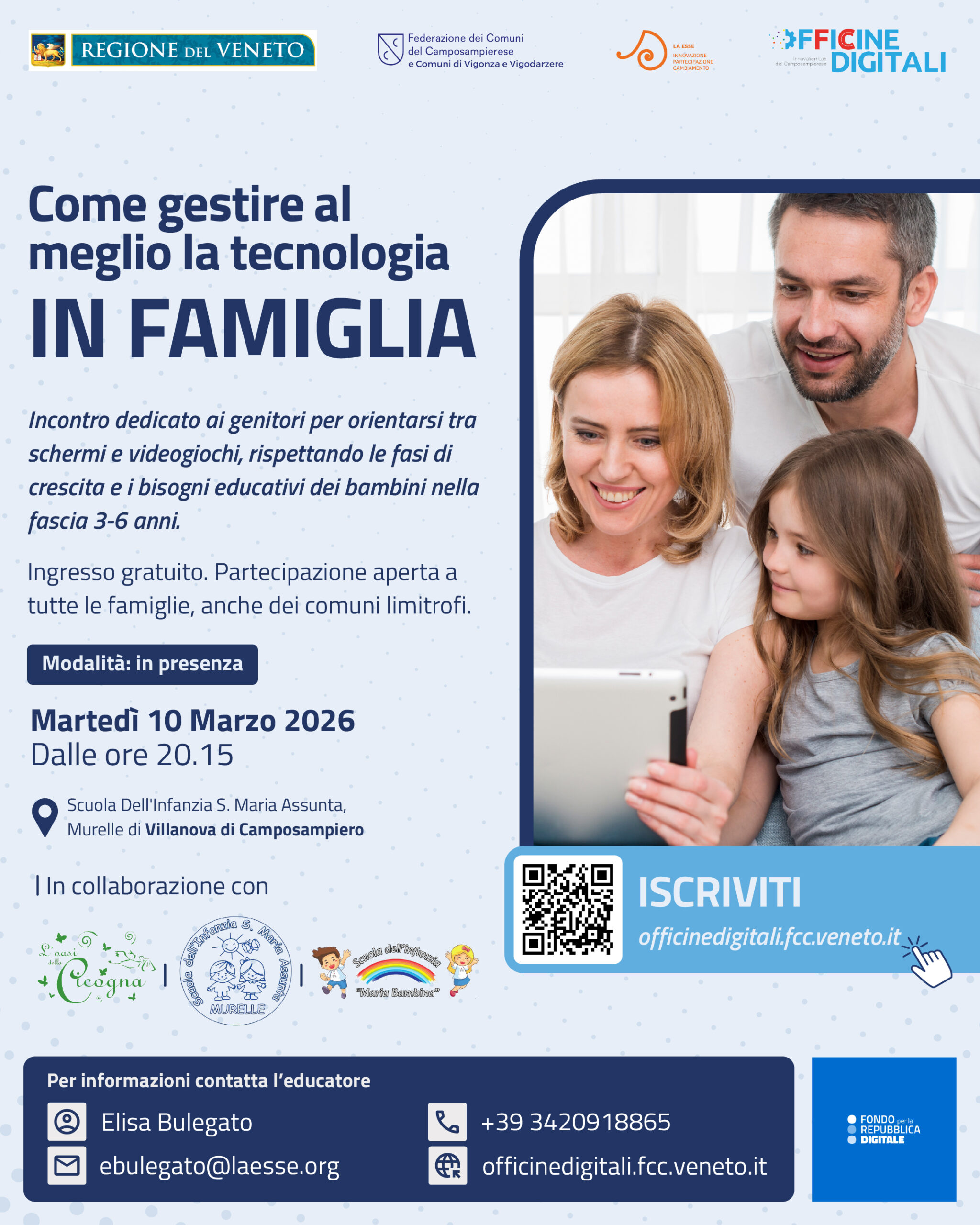 Nell’ambito dei percorsi formativi dal titolo "Come gestire al meglio la tecnologia in famiglia", rivolti ai genitori di bambini dai 3 ai 6 anni, l’amministrazione comunale propone un incontro laboratoriale per accompagnare i genitori in una riflessione pedagogica sull’impatto delle nuove tecnologie e dei videogiochi nella prima infanzia.