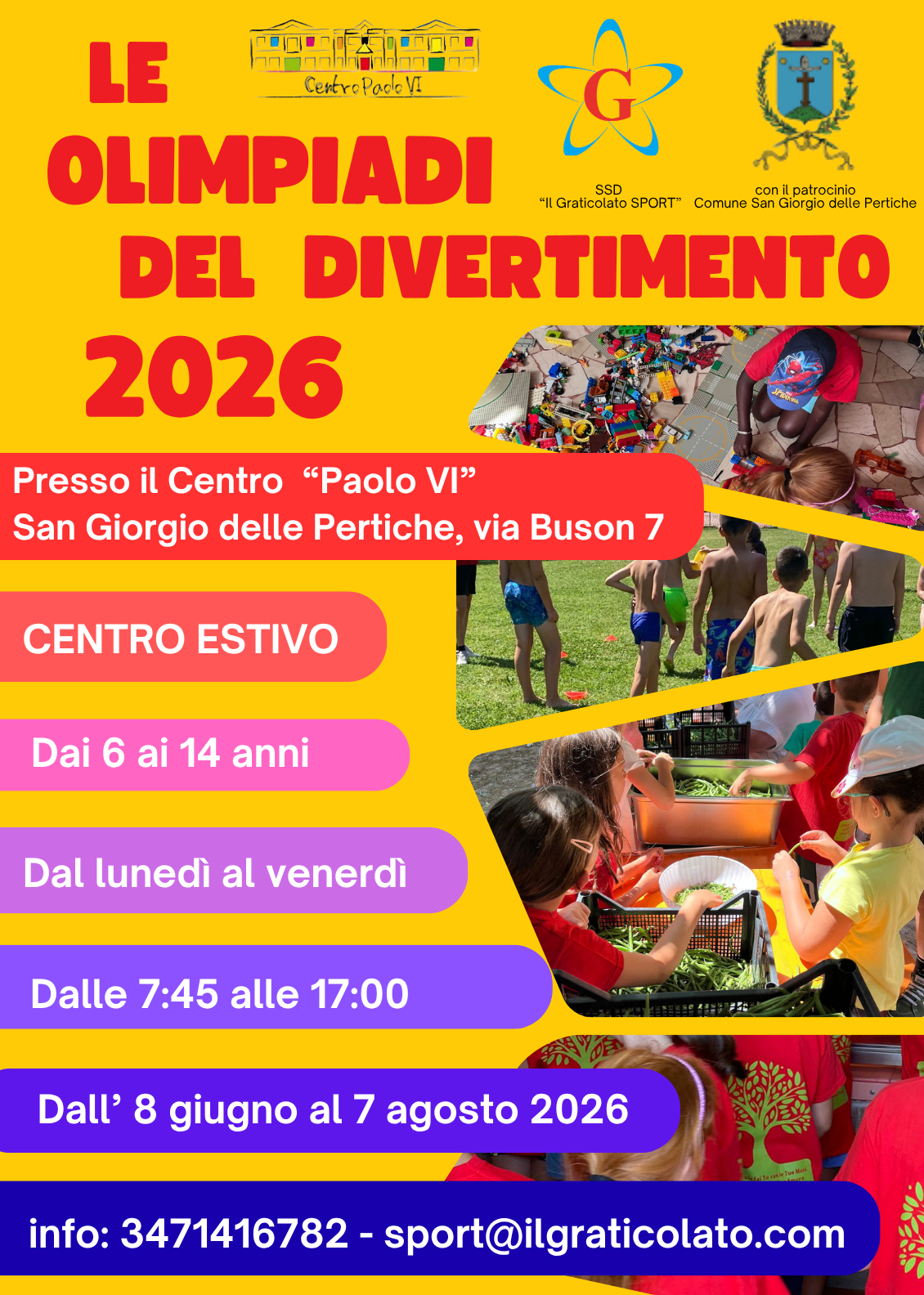 L’amministrazione comunale e la SSD “Il Graticolato Sport”, invitano tutta la cittadinanza a partecipare all’incontro di presentazione dei Centri Estivi “Le Olimpiadi del Divertimento 2026” che si terrà martedì 12 maggio 2026 alle ore 20:45 presso la sala “Rino Grandesso” nella Biblioteca Comunale (Via Pinaffo n. 9 – San Giorgio delle Pertiche).