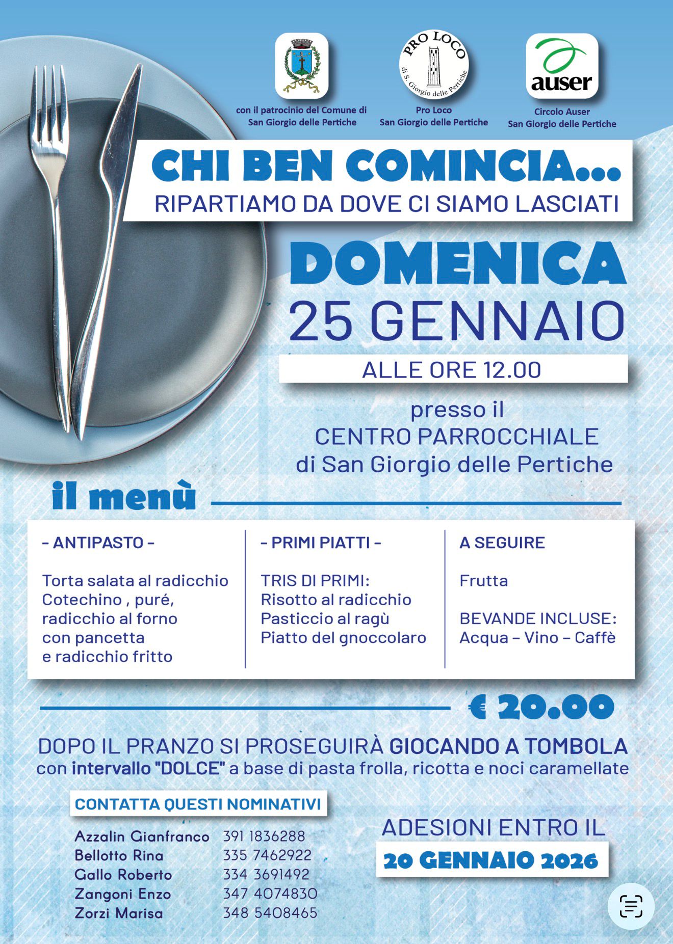 La Pro Loco con il patrocinio del Comune di San Giorgio delle Pertiche e la collaborazione dell'Auser organizza domenica 25 gennaio 2026 il Pranzo Conviviale "Chi Ben Comincia" Ripartiamo da dove ci siamo lasciati" presso il centro parrocchiale di San Giorgio delle Pertiche dalle ore 12:00.