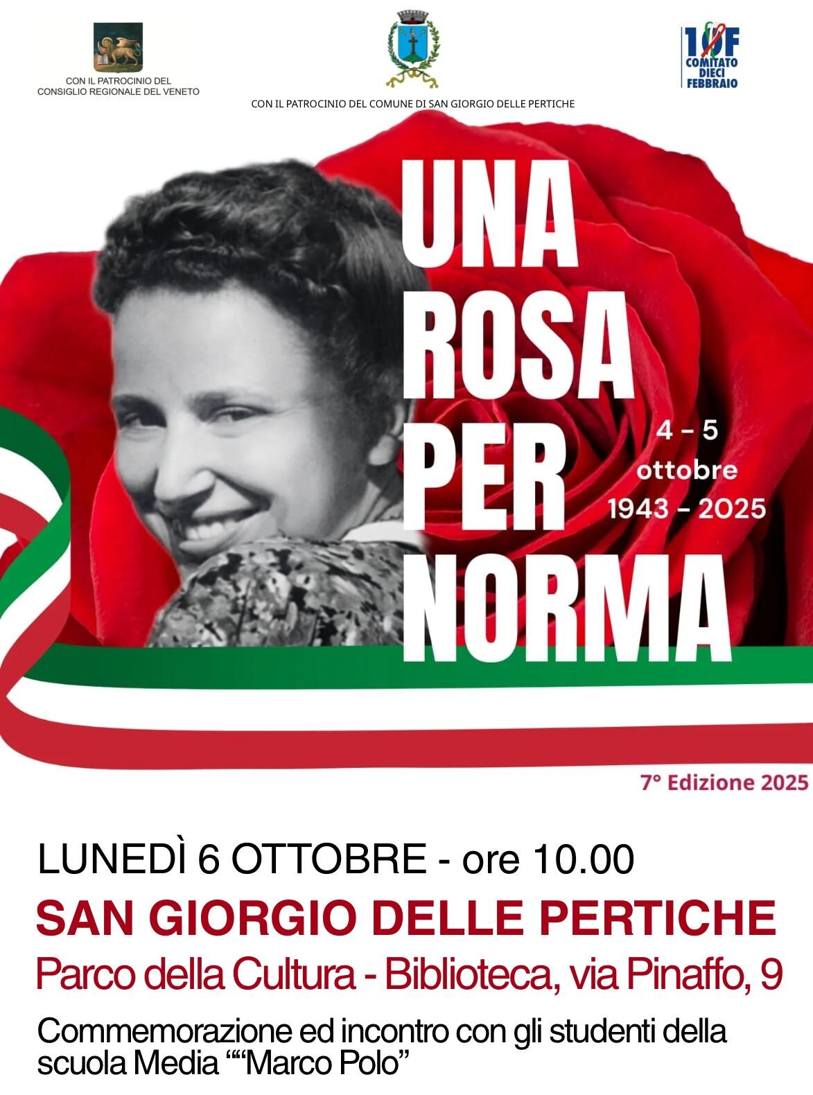 Lunedì 6 ottobre 2025 alle ore 10:00 presso il Parco della Cultura - Biblioteca Comunale si svolgerà la commemorazione in commemorazione “Una rosa in memoria di Norma Cossetto” giovane studentessa istriana che nel 1943 venne catturata, torturata e infoibata dai partigiani slavi. Parteciperanno anche gli studenti delle scuole medie "Marco Polo". Tutta la cittadinanza è invitata a partecipare.