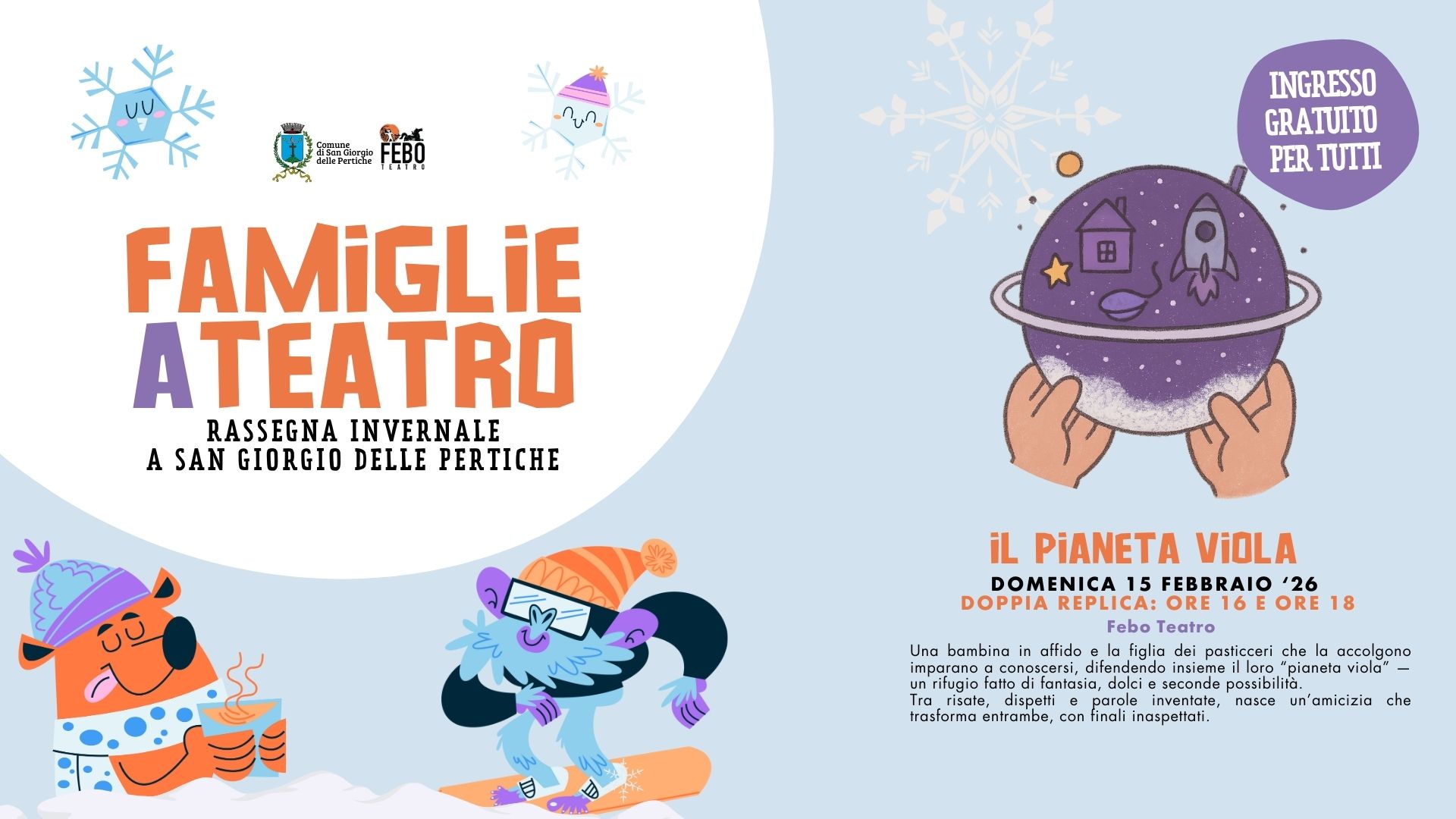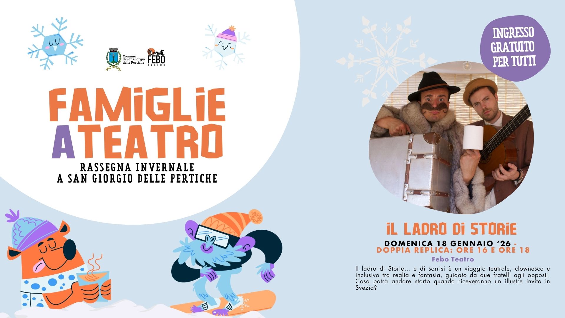 L’Amministrazione Comunale di San Giorgio delle Pertiche in collaborazione con l’associazione Febo Teatro è lieta di presentare una nuova edizione della rassegna invernale di Teatro per bambini e non solo che prevede tre appuntamenti:
