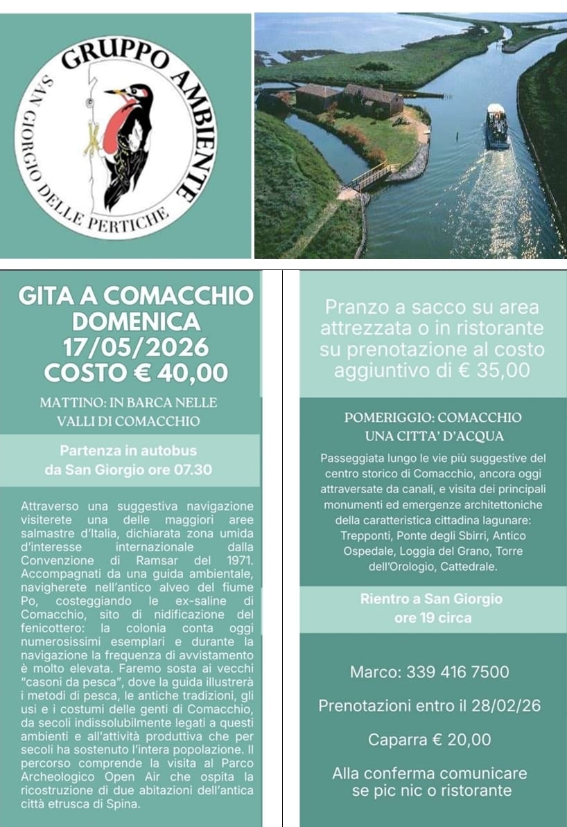 | Il Gruppo Ambiente di San Giorgio delle Pertiche con il contributo e la collaborazione dell’Amministrazione Comunale organizza domenica 17/05/2026 un’uscita a Comacchio.