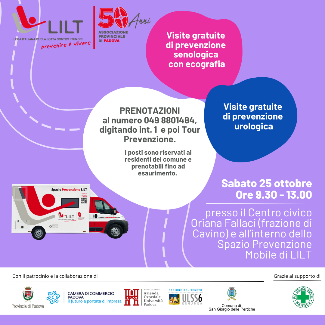 Sabato 25 ottobre 2025, il Comune di San Giorgio delle Pertiche ospiterà presso il Centro Civico “Oriana Fallaci”, una delle tappe del Tour della Prevenzione LILT 2025, promosso dalla Lega Italiana per la Lotta contro i Tumori.