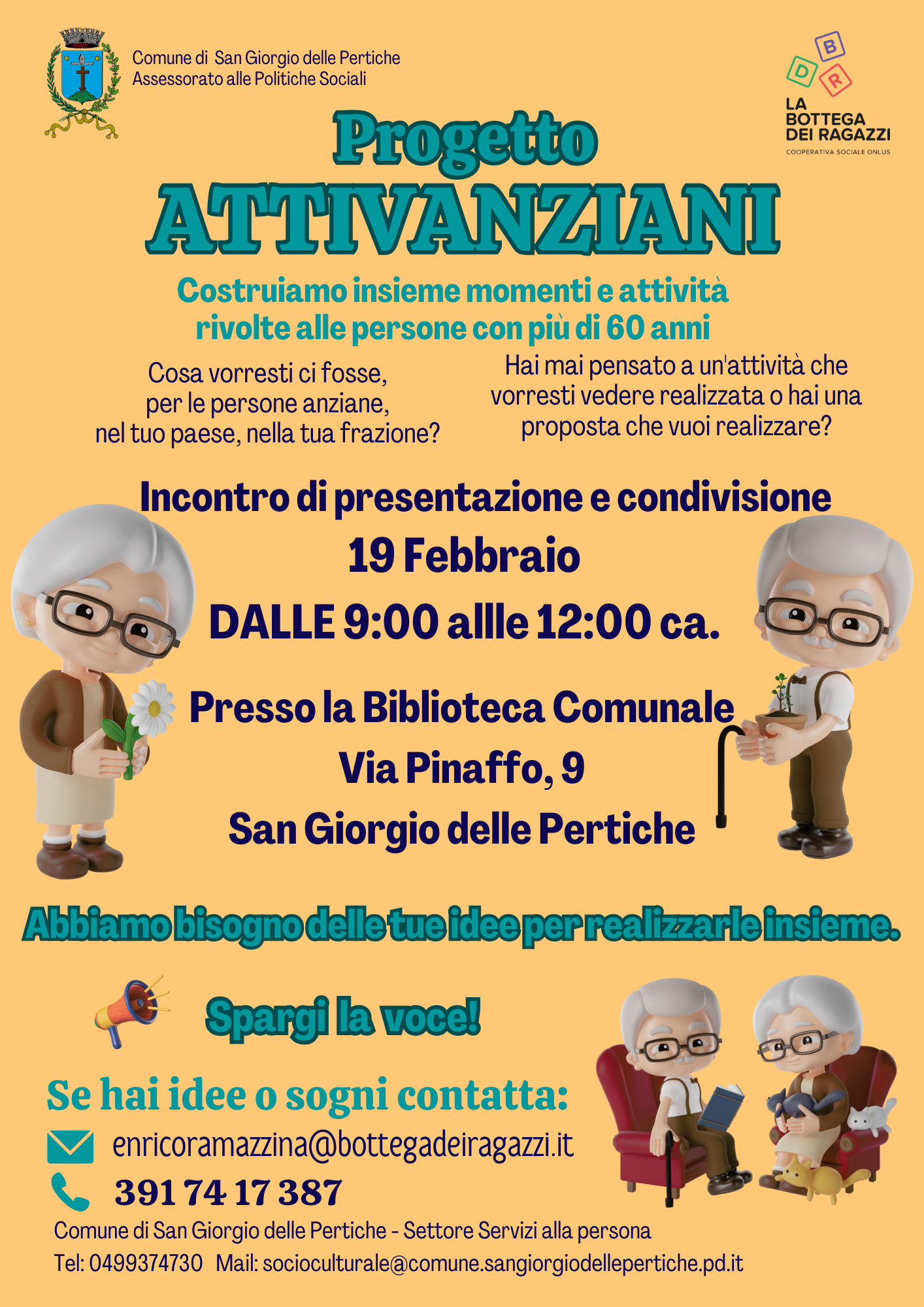 Vi aspettiamo lunedì 19 febbraio 2024 dalle 9:00 alle 12:00 ca. per un momento di presentazione del progetto e condivisione rispetto a nuove idee e proposte per il comune di San Giorgio delle Pertiche.
