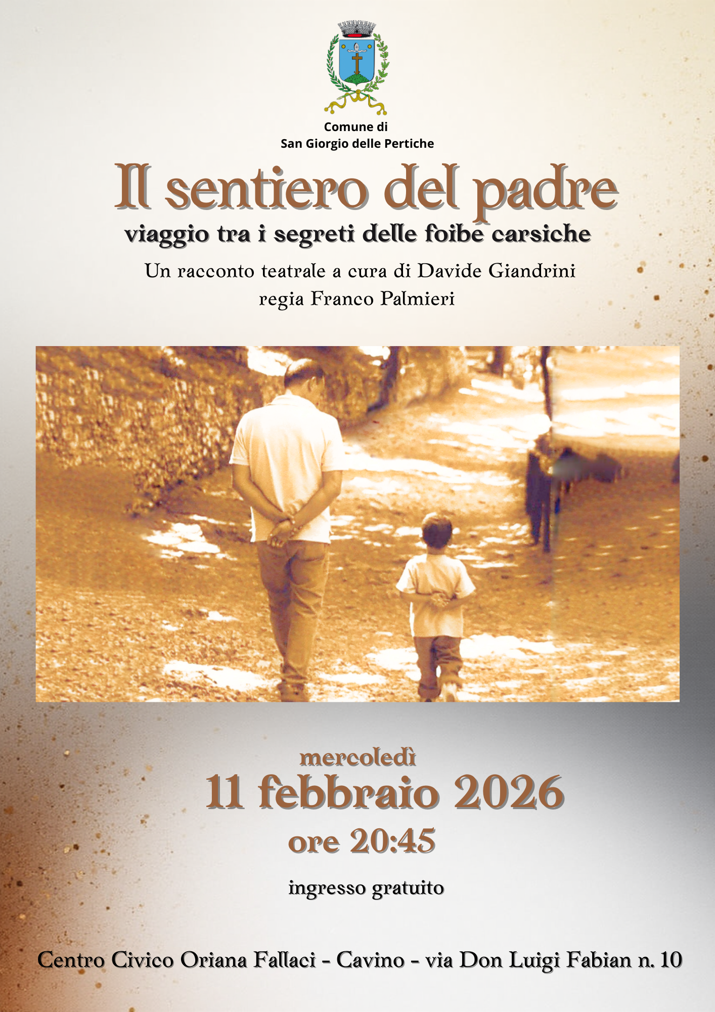 Lo spettacolo si terrà mercoledì 11 febbraio 2026 alle ore 20.45, presso il Centro Civico Oriana Fallaci di Cavino (via Don Luigi Fabian n. 10).